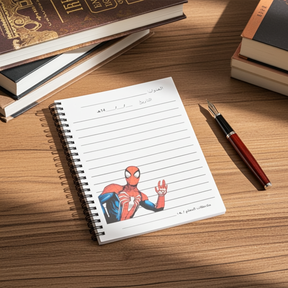 📌 السعر يشمل دفتر سبايدر مان بحجم مناسب مع 40 صفحة. يمكنك زيادة عدد الصفحات من الخيارات.