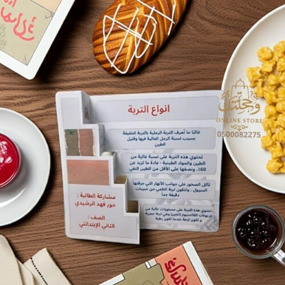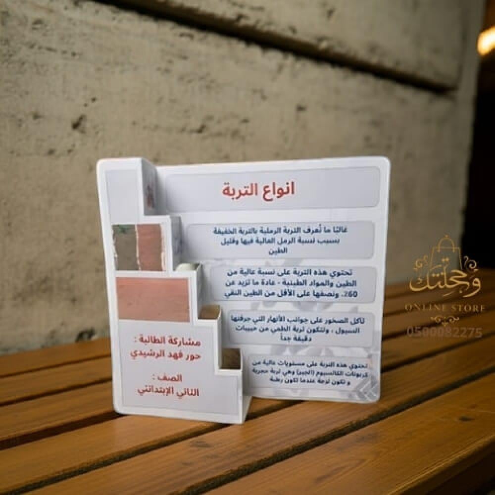 مطوية أنواع التربة التعليمية هي منتج تفاعلي مصمّم خصيصًا للأطفال في المرحلة الابتدائية، يعرض معلومات علمية بطريقة جذابة وسهلة الفهم.